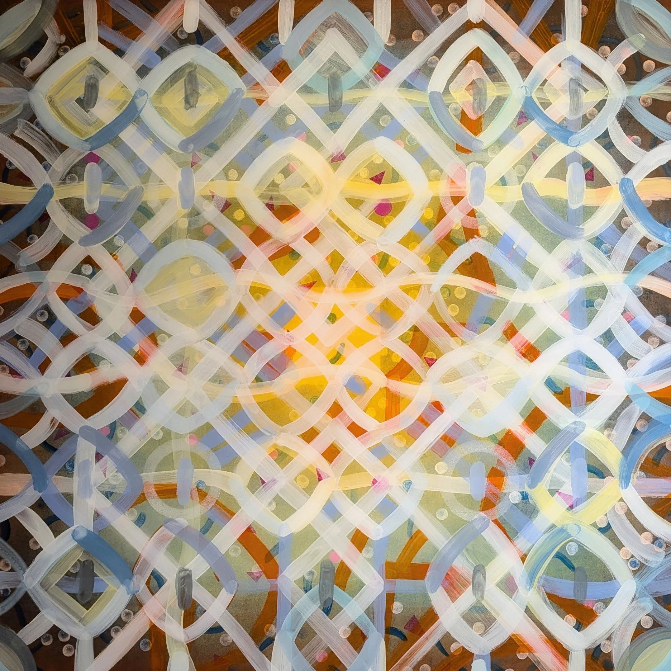 The color palette is a rainbow of colors, chosen to evoke warmth and light. While the intricate, tapestry-like pattern engages the viewer in a meditative visual experience. The use of transparency and overlapping gives the artwork, movement and dimensionality, drawing the viewer's eye towards the vibrant center where the warmest colors cluster. Words that describe this painting: Serenity, Connection, Unity.