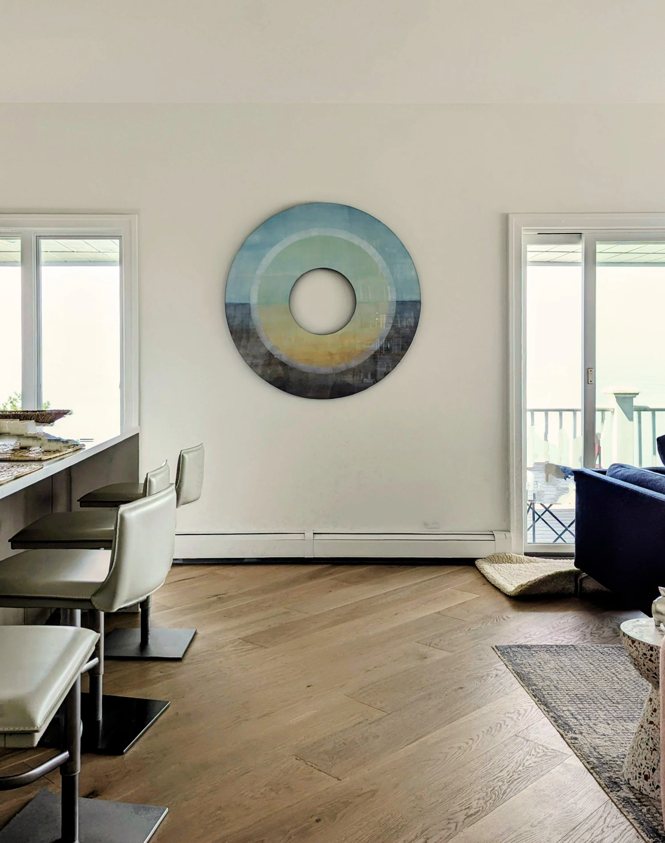 This original painting is a circular art piece, with a large evenly shaped hole in the center. It is painted on acrylic glass and mounted onto a handmade wooden circular frame. The use of a circular format with a void in the middle is both striking and intriguing. As it changes the painting narrative.