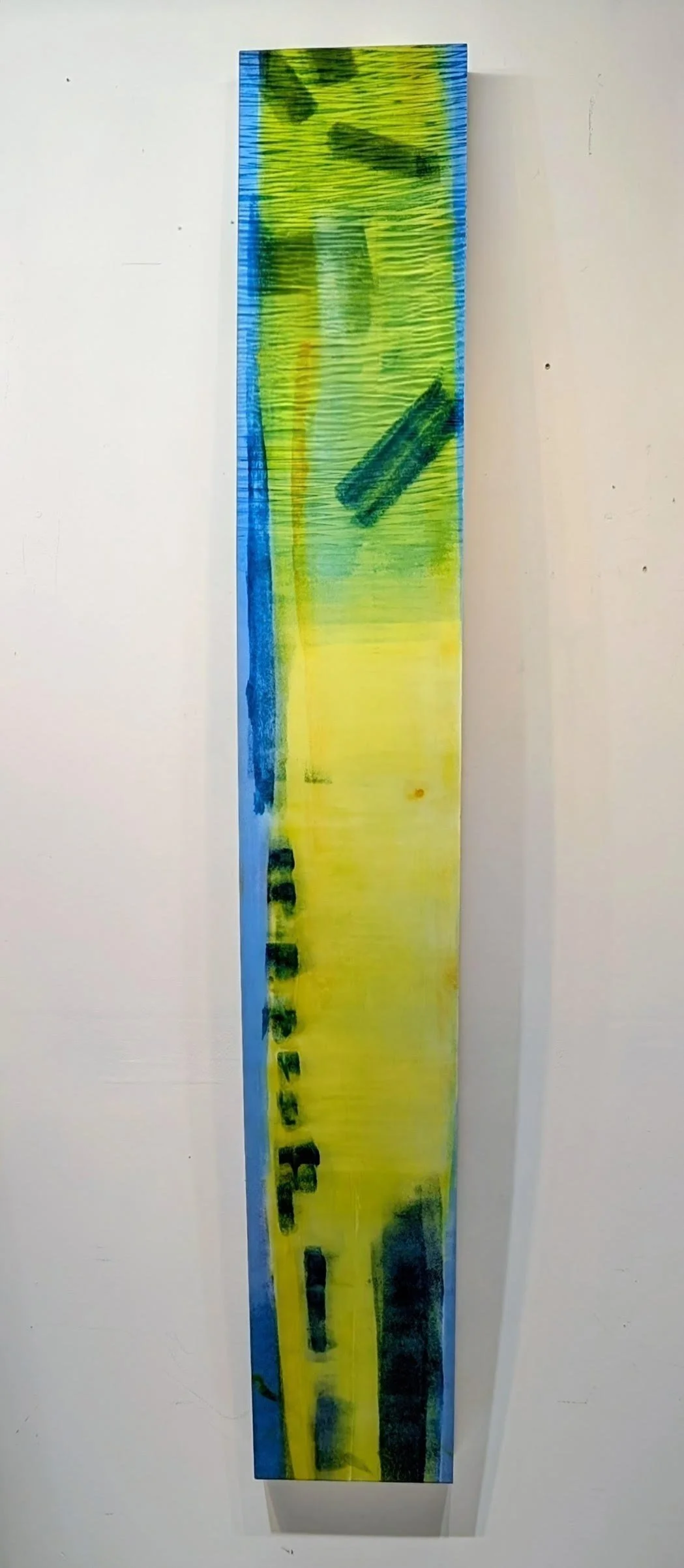 This is the third in my series of large sculptural arches. The palette is predominantly cool, with varying shades of blues and muted greens, interspersed with soft, glowing ocher yellows and hints of pale grays. The feeling is wave-like and ethereal and the overall impression is one of Serenity.