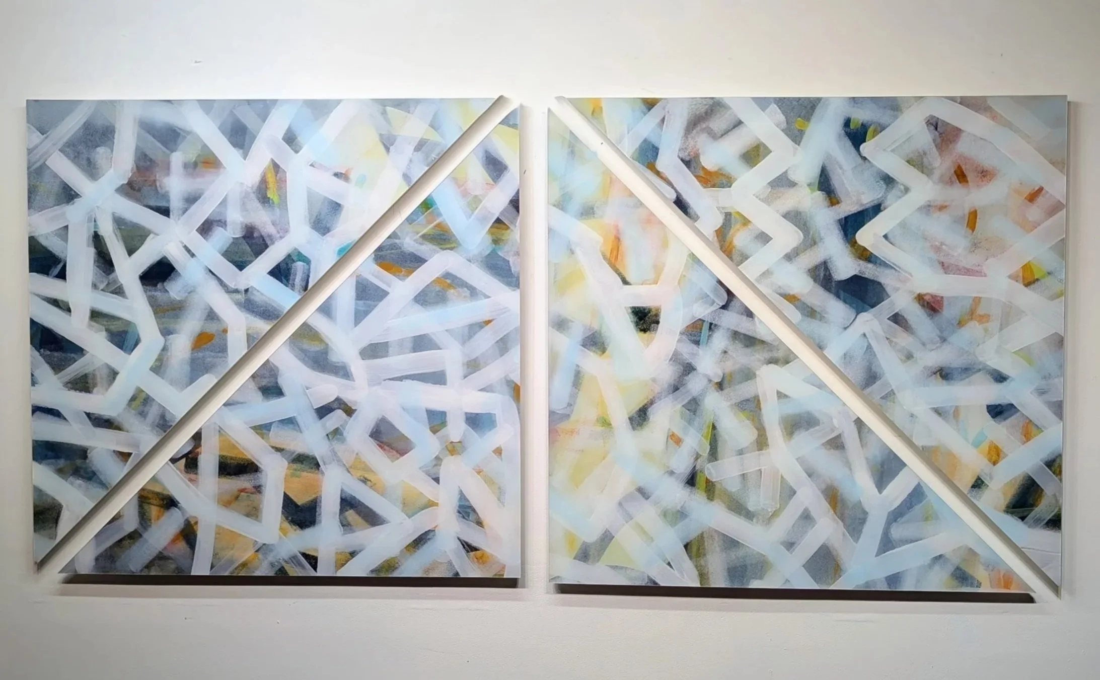 This artwork consists of four individual triangular paintings. An intricate web of painterly overlapping white, linear patterns, intersect and crisscross over softly diffused and layered background colors of muted, blues, grays and olive yellows, with occasional touches of burnt orange and Rose blush reds. The colors are soft and meditative, while the white line work is bold yet layered, giving the viewer glimpses of delicate underlying colors completing the pathways of its rhythmic, meditative journey.
