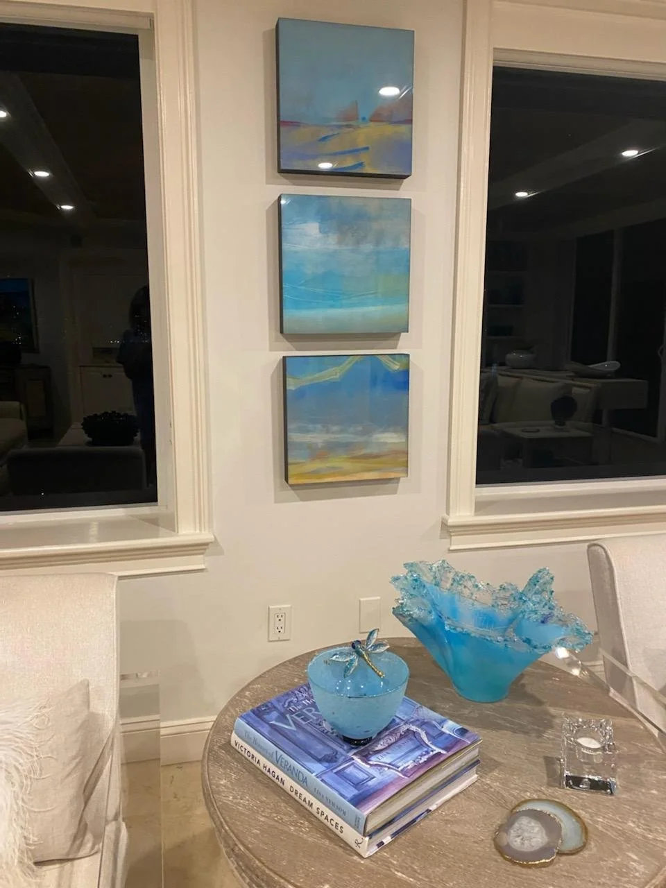 The color gradient and simplicity of design creates a soothing rhythm to visually transport. The viewer to a place of emotional, serenity and meditation. Words to describe this piece would include: Tranquility, vastness, calm and introspection.