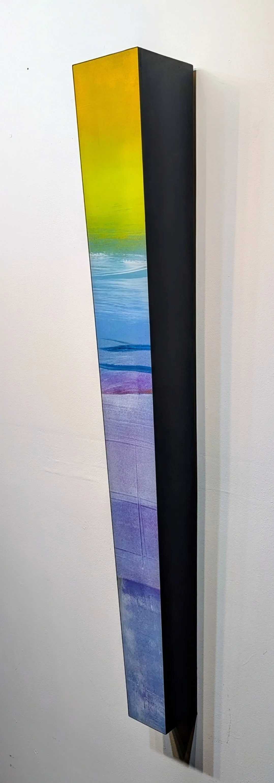 This unique, sculptural piece is created in the shape of a plinth. The area of the top is 13 in. X 6 in, suitable for placing another piece of art. The shape is 60 in tall and angles backwards towards the wall as it descends, transitioning into a smaller foot. Cool, pale blues, olive greens and grays combine with pale yellows and light blues.